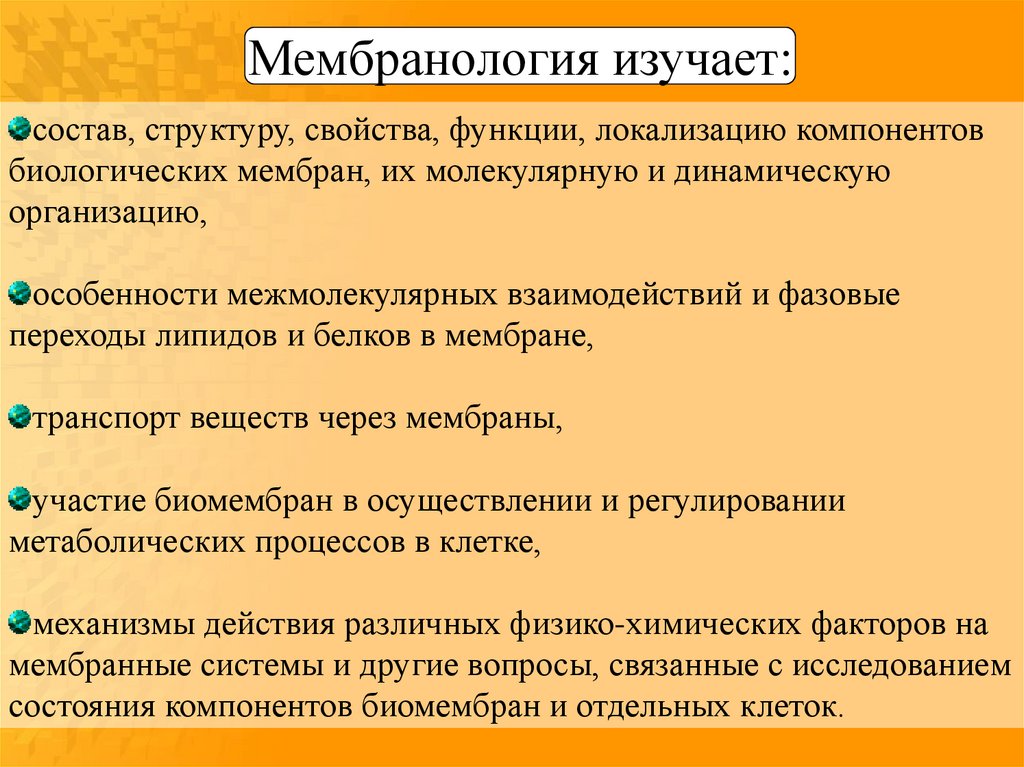 Мембранология изучает:состав, структуру, свойства, функции, локализацию компонентов
