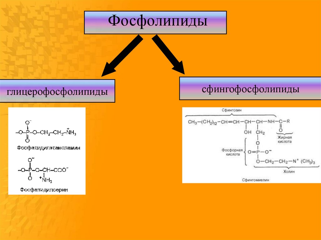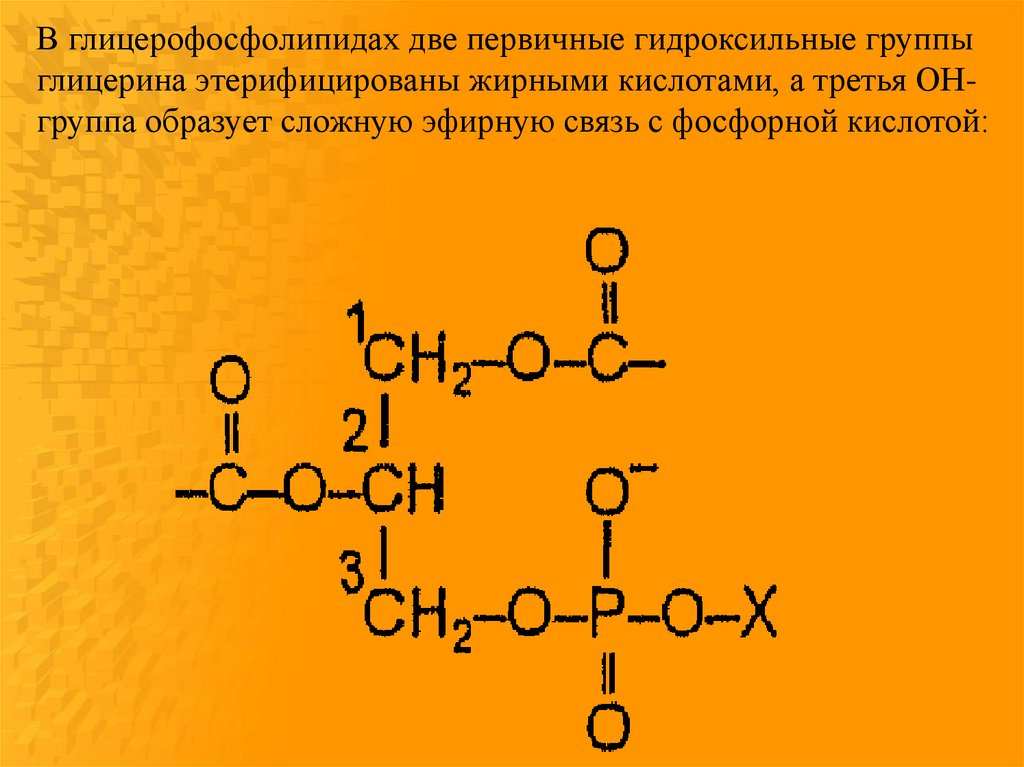 В глицерофосфолипидах две первичные гидроксильные группыглицерина этерифицированы жирными кислотами, а третья ОНгруппа образует сложную эфирную связь с фосфорной кислотой: