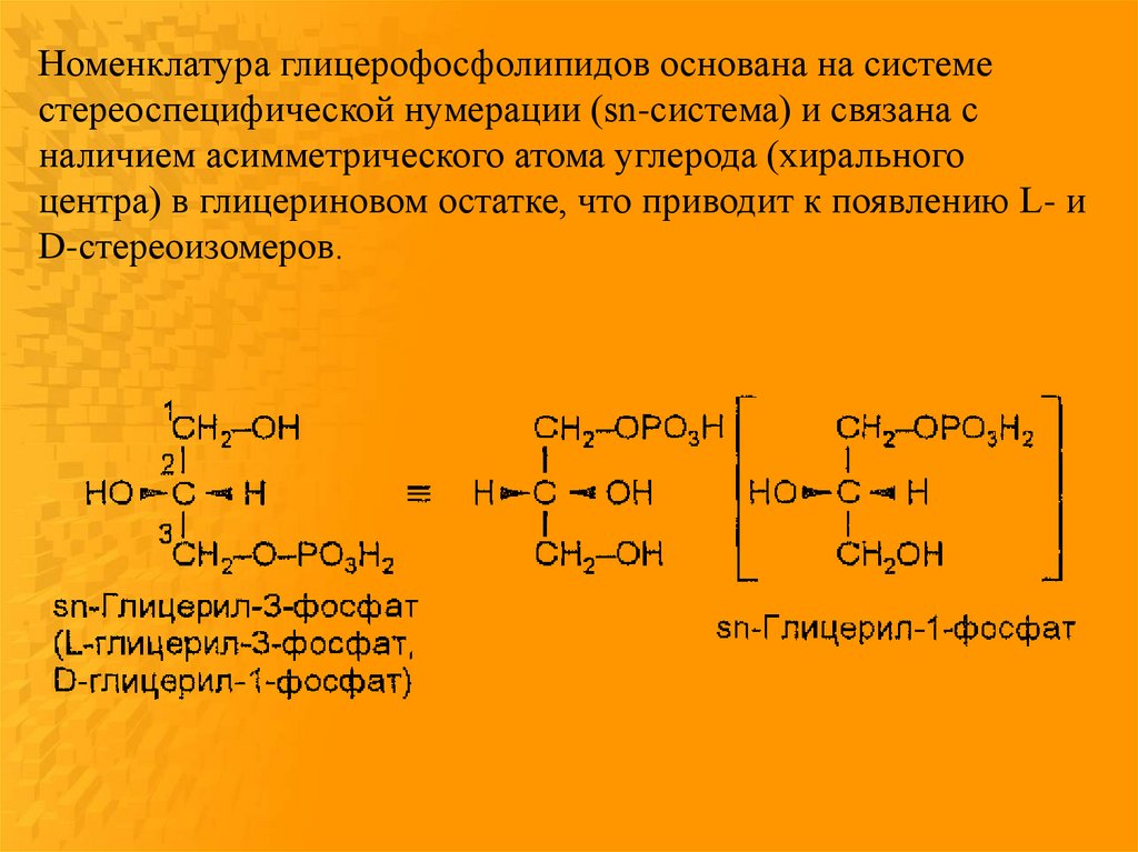 Номенклатура глицерофосфолипидов основана на системестереоспецифической нумерации (sn-система) и связана с