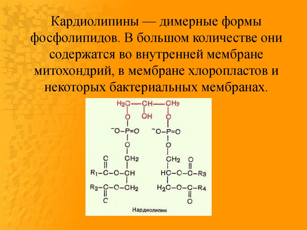 Кардиолипины — димерные формыфосфолипидов. В большом количестве они