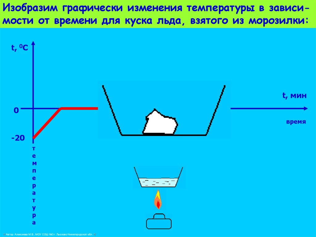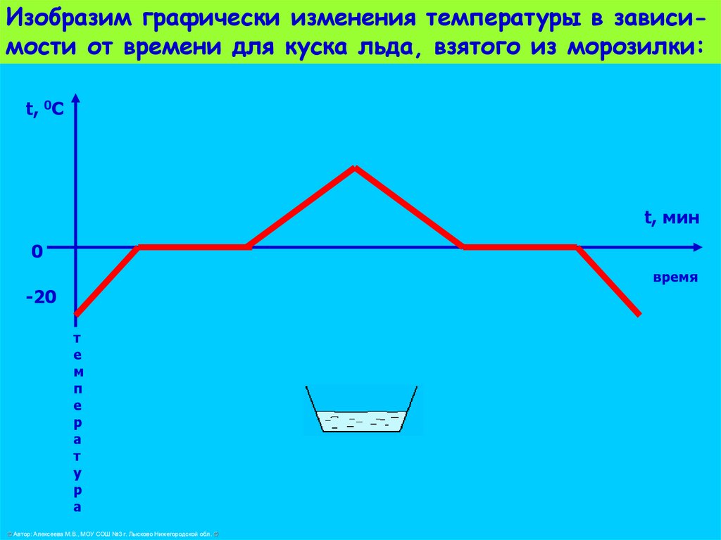 Изобразим графически изменения температуры в зависимости от времени для куска льда, взятого из морозилки:t, 0С