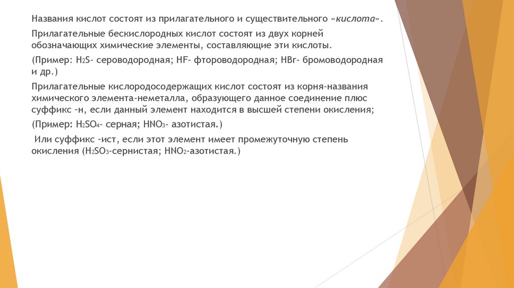 Названия кислот состоят из прилагательного и существительного «кислота».Прилагательные бескислородных кислот состоят из двух корней