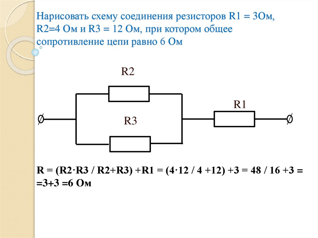 1. Нарисовать схему соединения резисторов R1= 2 Ом, R2= 4 Ом иR3 =6 Ом, в котором общее сопротивление цепи равно 3 Ом.