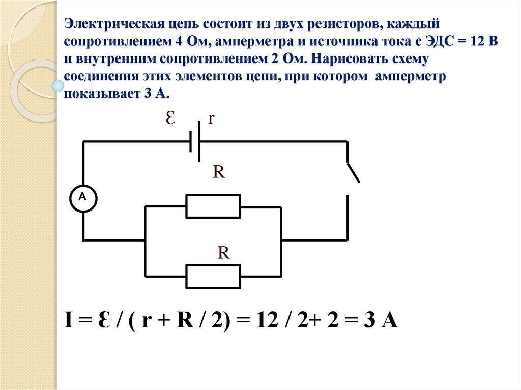 Электрическая цепь состоит из двух резисторов, каждыйсопротивлением 4 Ом, амперметра и источника тока с ЭДС = 12 В