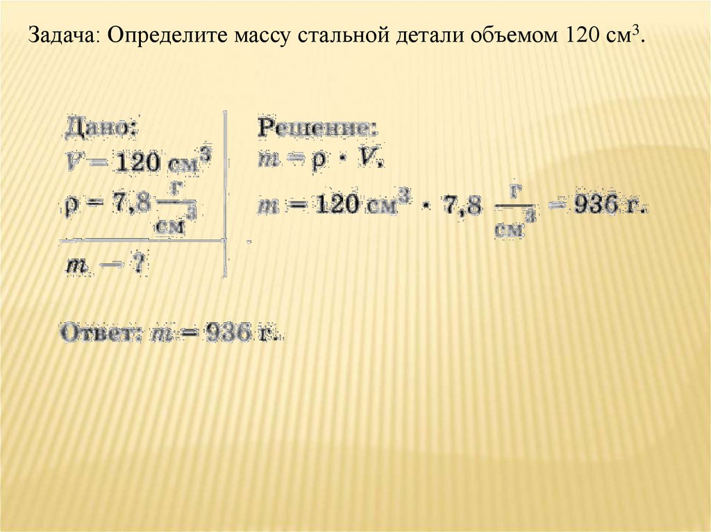 Задача: Определите массу стальной детали объемом 120 см3.6.