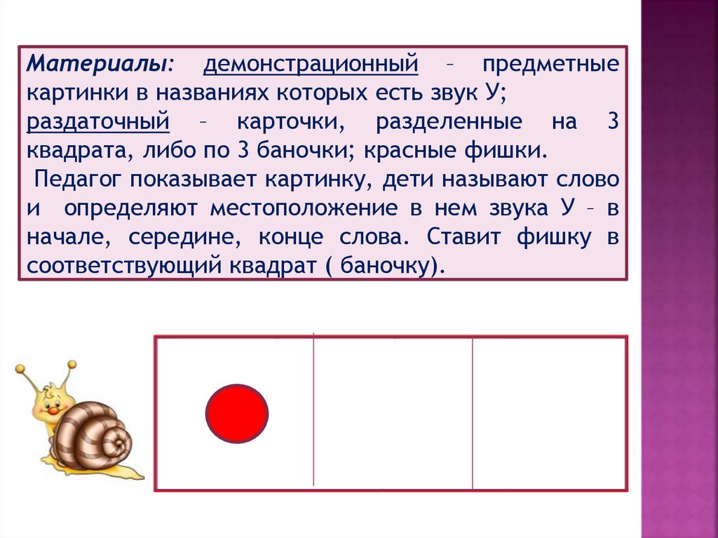 Материалы: демонстрационный – предметныекартинки в названиях которых есть звук У;