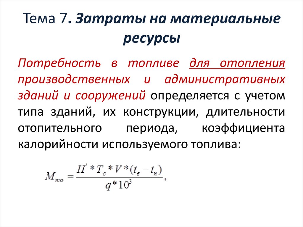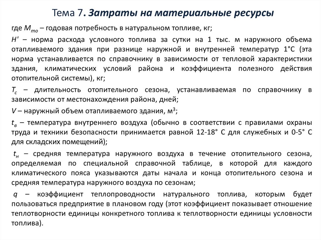 Тема 7. Затраты на материальные ресурсыгде Мто – годовая потребность в натуральном топливе, кг;