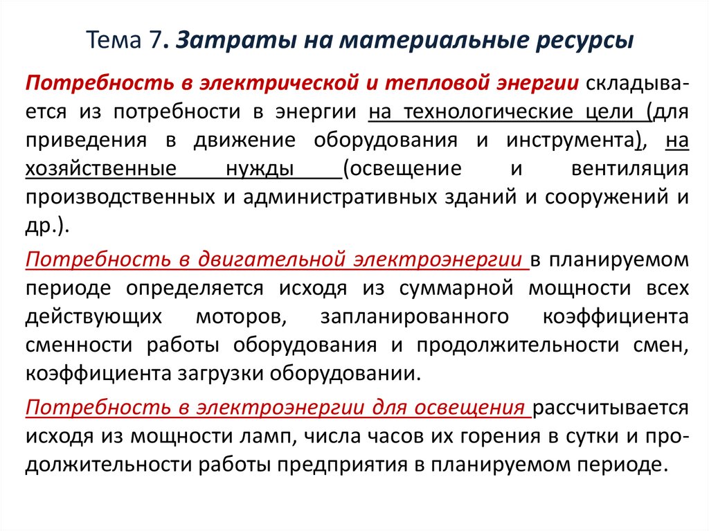Тема 7. Затраты на материальные ресурсыПотребность в электрической и тепловой энергии складывается из потребности в энергии на технологические цели (для
