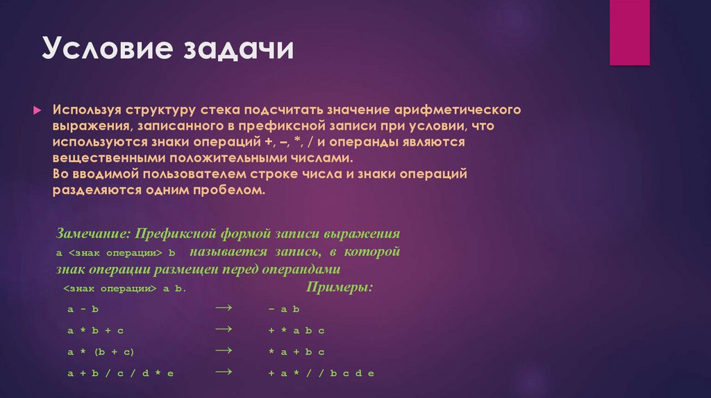 Условие задачиИспользуя структуру стека подсчитать значение арифметического