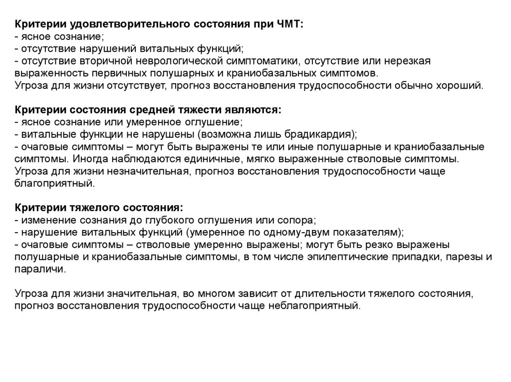 Критерии удовлетворительного состояния при ЧМТ:- ясное сознание;
