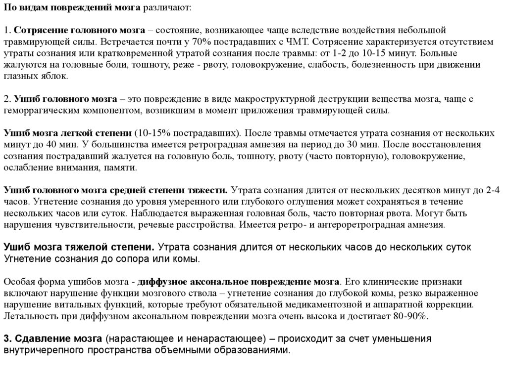 По видам повреждений мозга различают:1. Сотрясение головного мозга – состояние, возникающее чаще вследствие воздействия небольшой