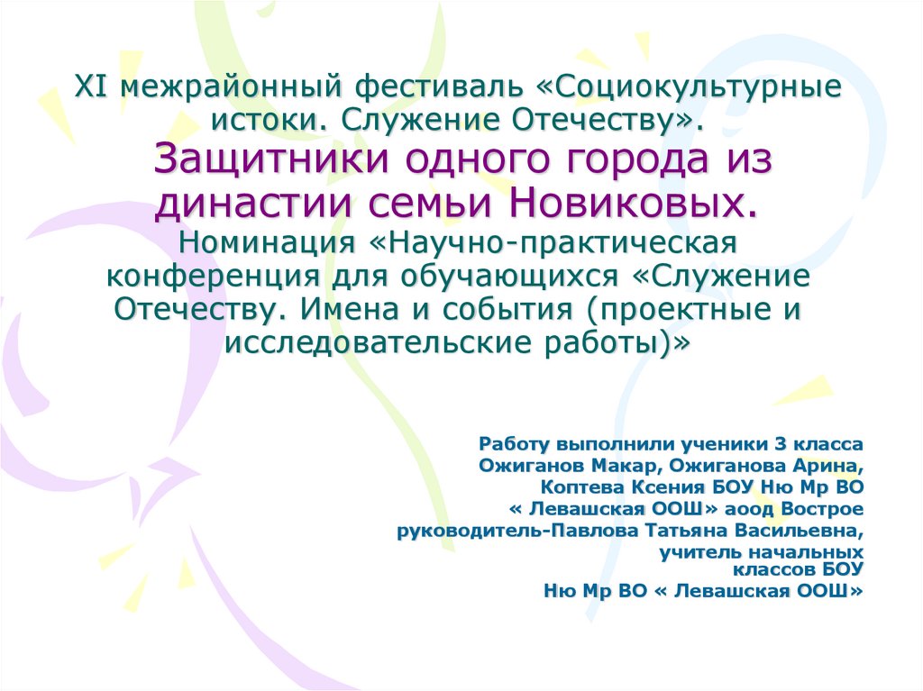 1. ХI межрайонный фестиваль «Социокультурные истоки. Служение Отечеству». Защитники одного города из династии семьи Новиковых.
