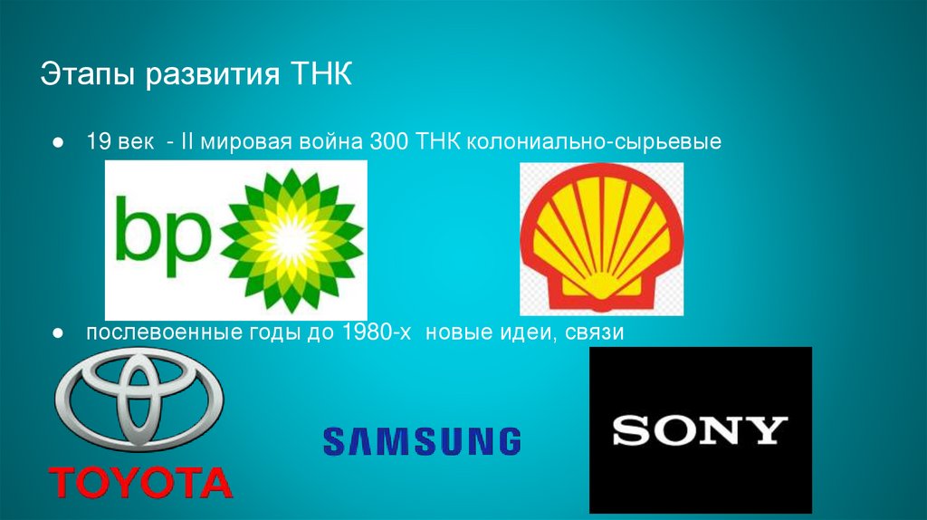 Этапы развития ТНК● 19 век - II мировая война 300 ТНК колониально-сырьевые