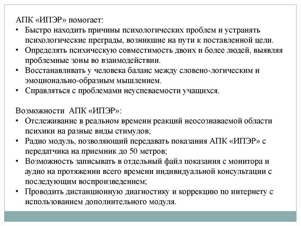 АПК «ИПЭР» помогает:• Быстро находить причины психологических проблем и устранять