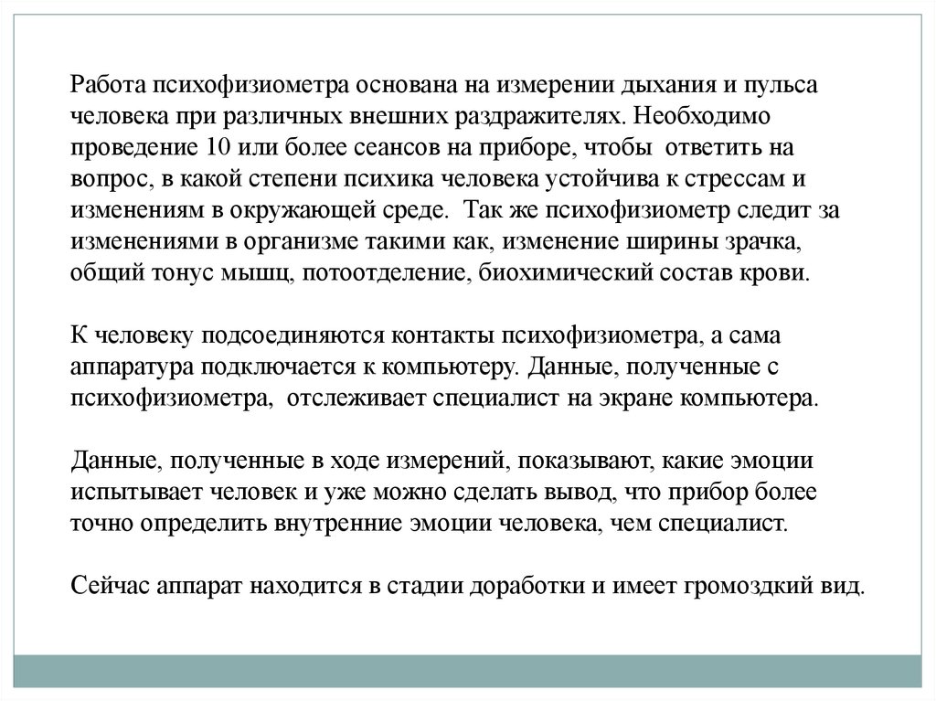 Работа психофизиометра основана на измерении дыхания и пульсачеловека при различных внешних раздражителях. Необходимо