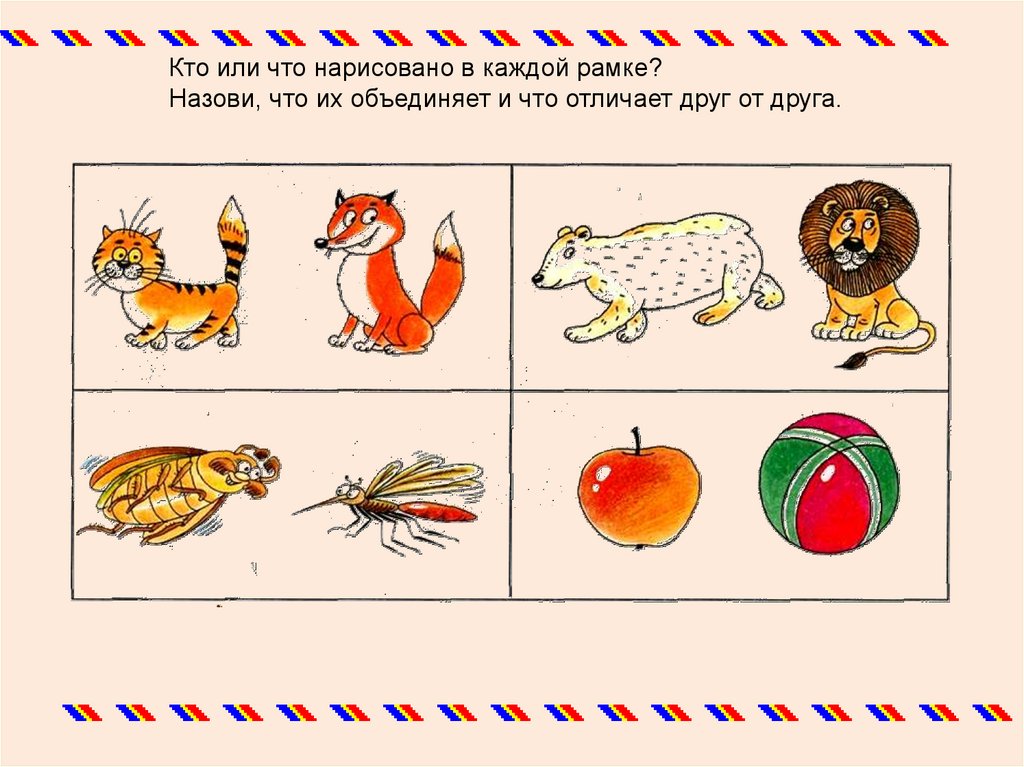 Кто или что нарисовано в каждой рамке?Назови, что их объединяет и что отличает друг от друга.