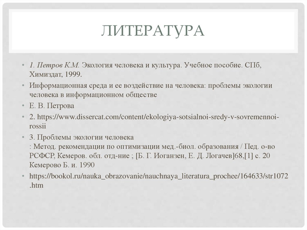 ЛИТЕРАТУРА• 1. Петров К.М. Экология человека и культура. Учебное пособие. СПб,