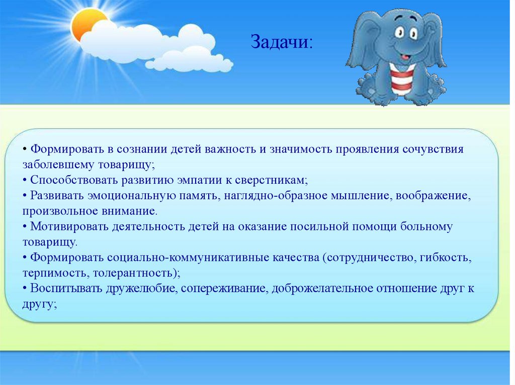 Задачи:• Формировать в сознании детей важность и значимость проявления сочувствия