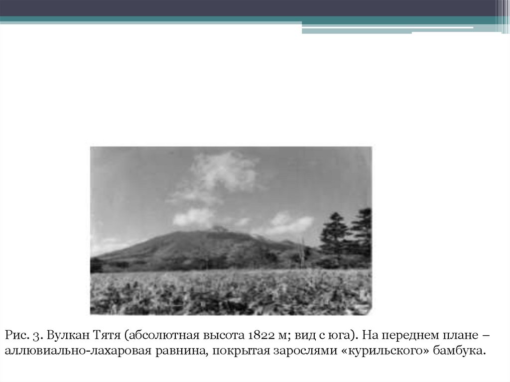 Рис. 3. Вулкан Тятя (абсолютная высота 1822 м; вид с юга). На переднем плане –аллювиально-лахаровая равнина, покрытая зарослями «курильского» бамбука.