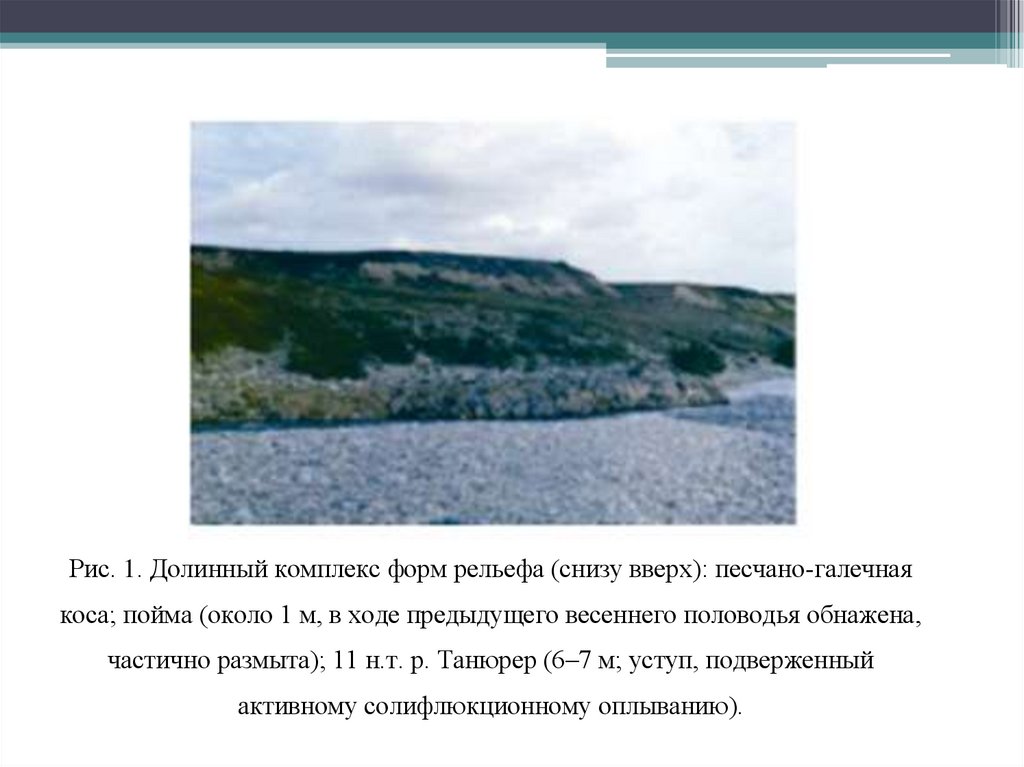 Рис. 1. Долинный комплекс форм рельефа (снизу вверх): песчано-галечнаякоса; пойма (около 1 м, в ходе предыдущего весеннего половодья обнажена,