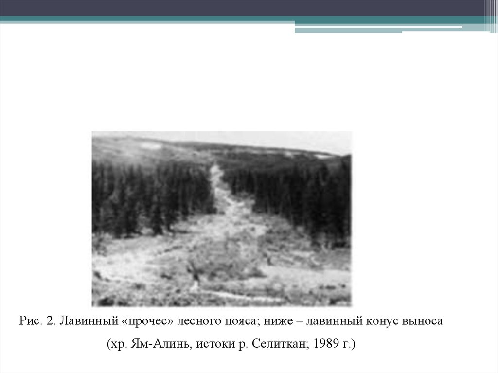 Рис. 2. Лавинный «прочес» лесного пояса; ниже – лавинный конус выноса(хр. Ям-Алинь, истоки р. Селиткан; 1989 г.)