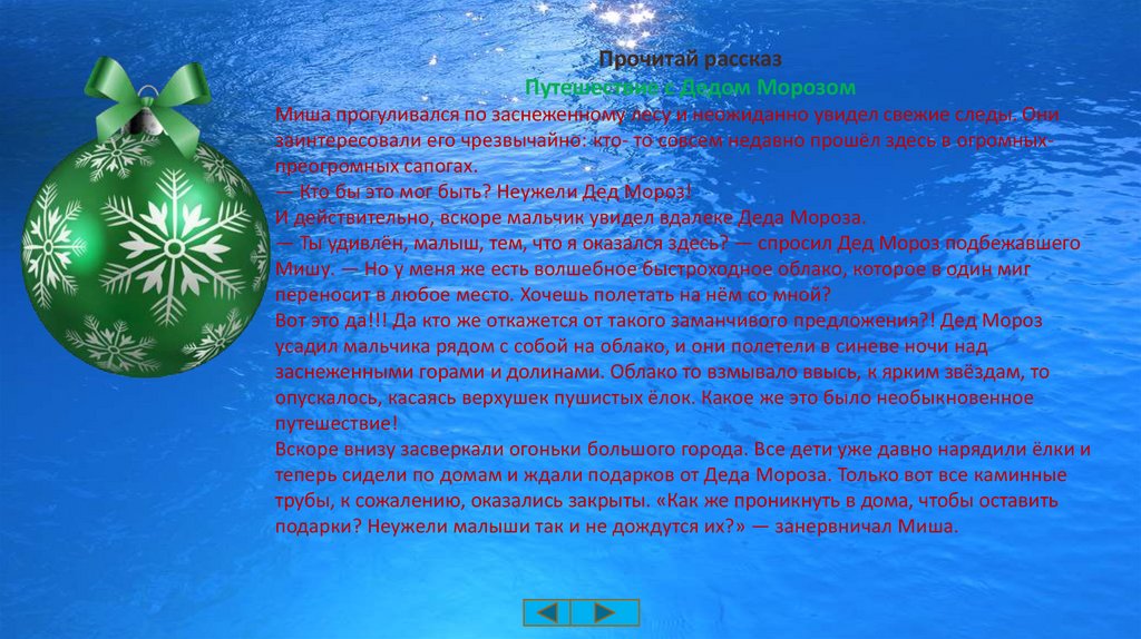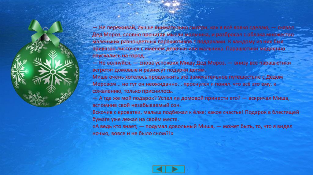 — Не переживай, лучше внимательно смотри, как я всё ловко сделаю, — сказалДед Мороз, словно прочитав мысли мальчика, и разбросал с облака множество