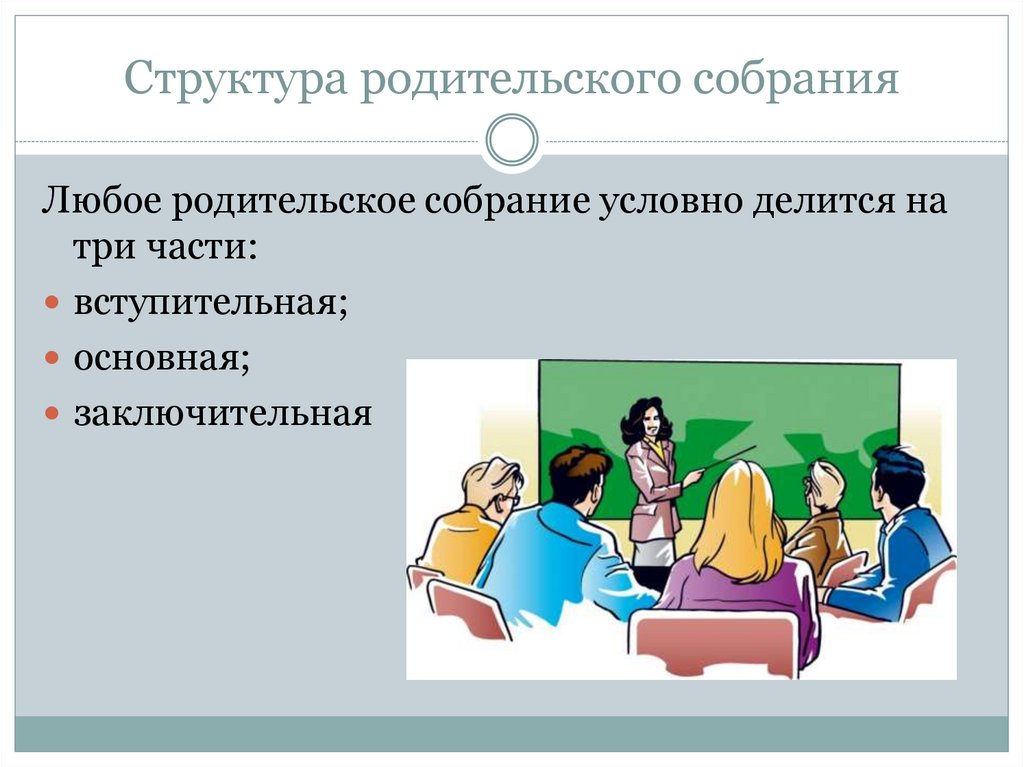 Структура родительского собранияЛюбое родительское собрание условно делится на