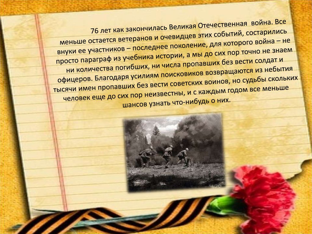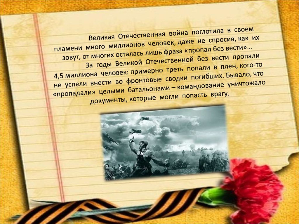 Пропасть без вести – не значит раствориться во тьме истории, поэтомубезымянные герои живы в сердцах людей. Память о каждом солдате, защищавшем