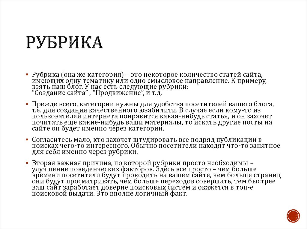 Рубрика (она же категория) – это некоторое количество статей сайта,имеющих одну тематику или одно смысловое направление. К примеру,