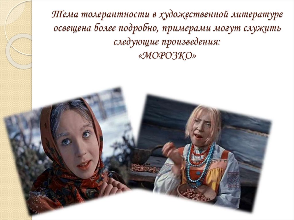 Тема толерантности в художественной литературеосвещена более подробно, примерами могут служить
