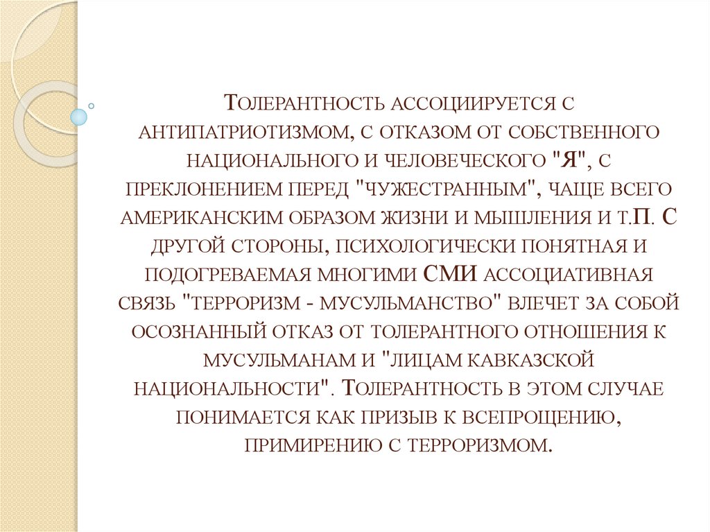 ТОЛЕРАНТНОСТЬ АССОЦИИРУЕТСЯ САНТИПАТРИОТИЗМОМ, С ОТКАЗОМ ОТ СОБСТВЕННОГО
