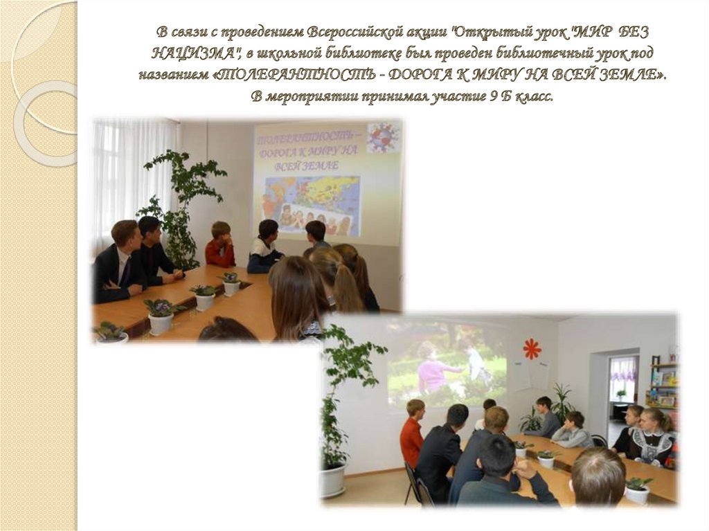В связи с проведением Всероссийской акции "Открытый урок "МИР БЕЗНАЦИЗМА", в школьной библиотеке был проведен библиотечный урок под