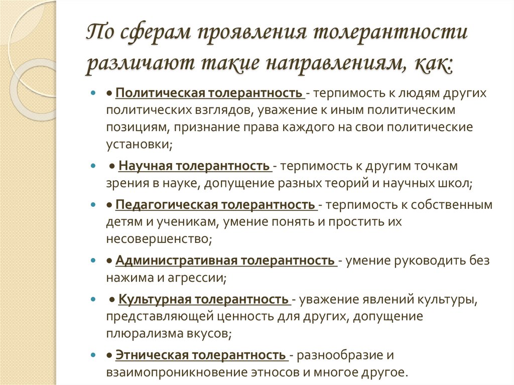 По сферам проявления толерантностиразличают такие направлениям, как: