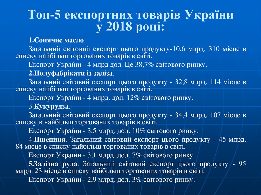 1.Сонячне масло.Загальний світовий експорт цього продукту-10,6 млрд. 310 місце в