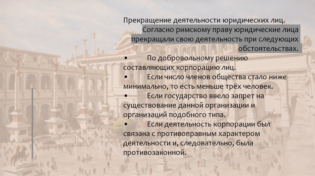 Прекращение деятельности юридических лиц.Согласно римскому праву юридические лица