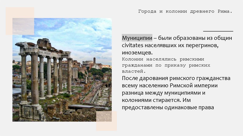 Города и колонии древнего Рима.Муниципии – были образованы из общин