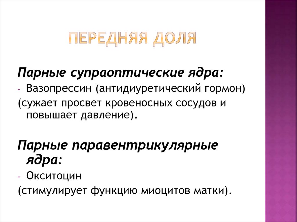 Парные супраоптические ядра:Вазопрессин (антидиуретический гормон)