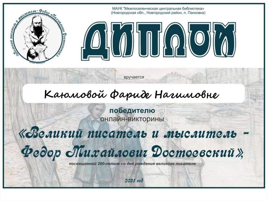 Диплом победителю онлайн - викторины Каюмовой Фариде Нагимовне
