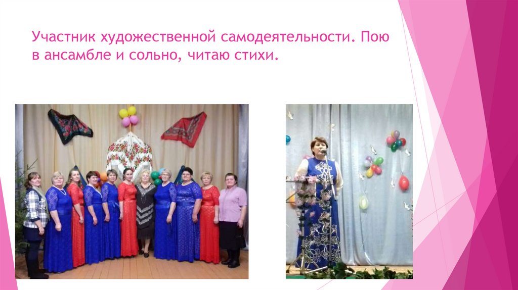 Участник художественной самодеятельности. Поюв ансамбле и сольно, читаю стихи.