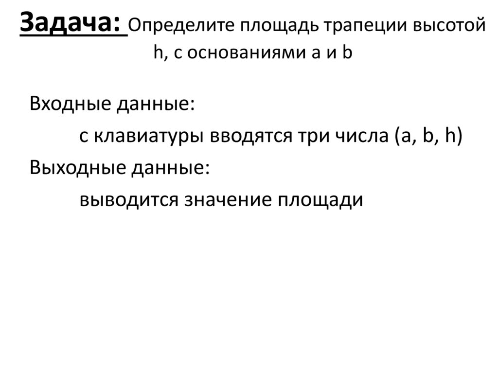 Задача: Определите площадь трапеции высотойh, с основаниями a и b