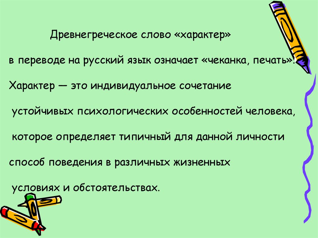 Древнегреческое слово «характер»в переводе на русский язык означает «чеканка, печать».