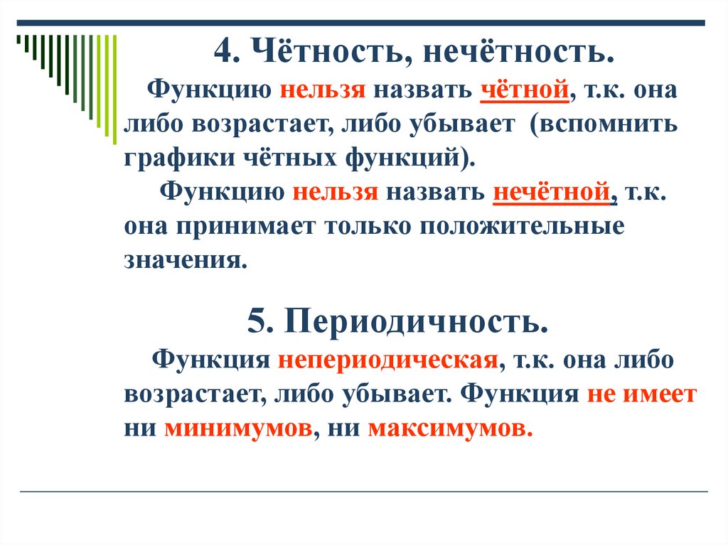 4. Чётность, нечётность.Функцию нельзя назвать чётной, т.к. она