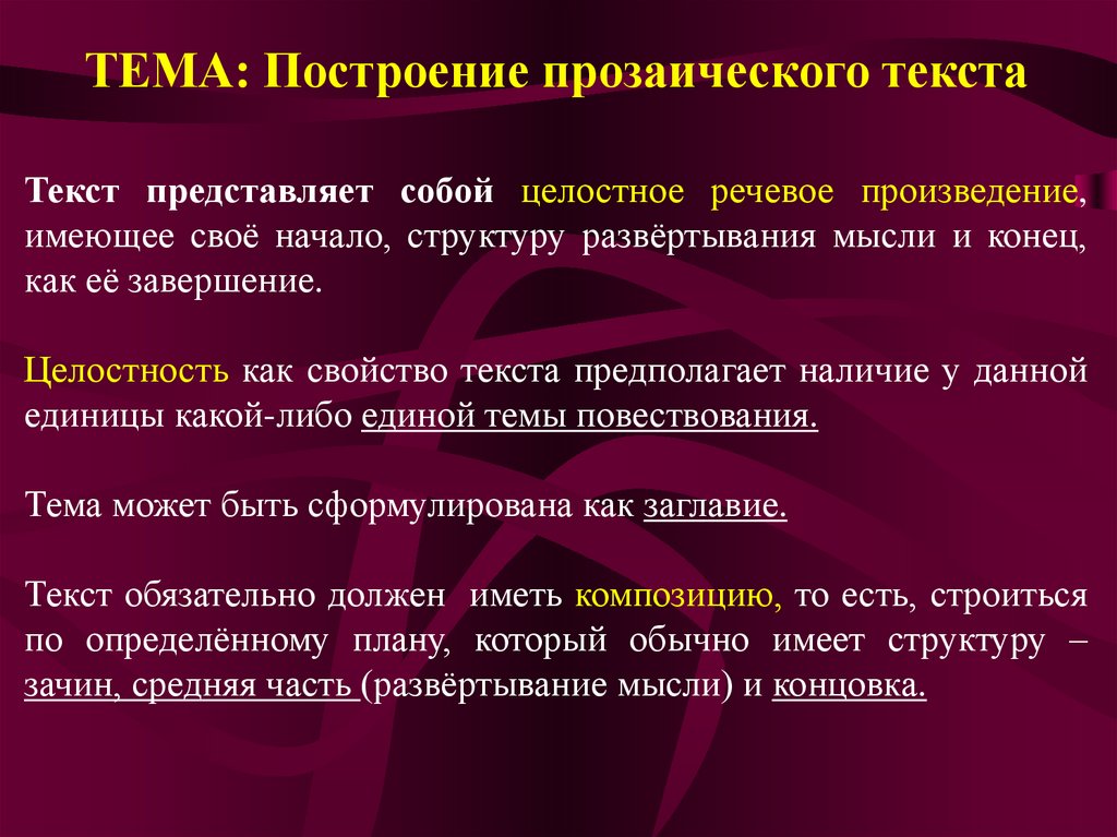 ТЕМА: Построение прозаического текстаТекст представляет собой целостное речевое произведение,