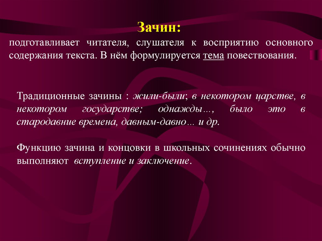 Зачин:подготавливает читателя, слушателя к восприятию основного