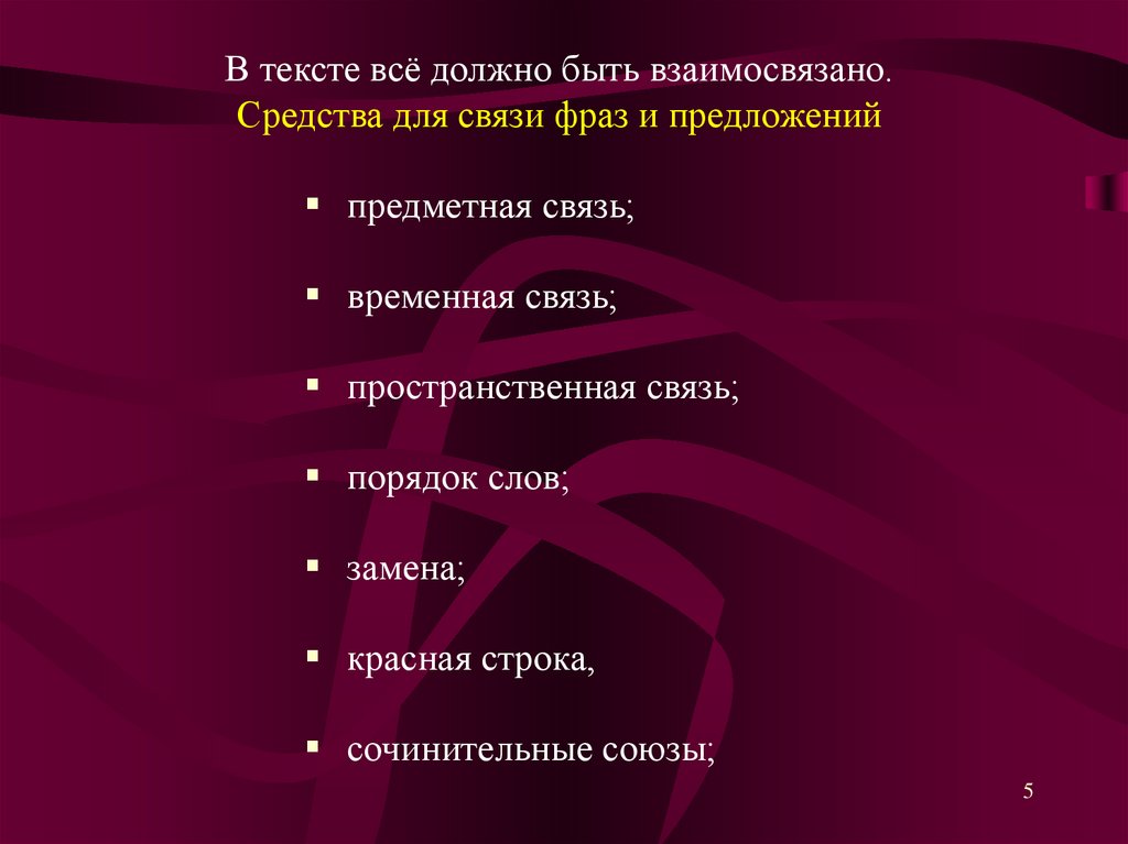В тексте всё должно быть взаимосвязано.Средства для связи фраз и предложений