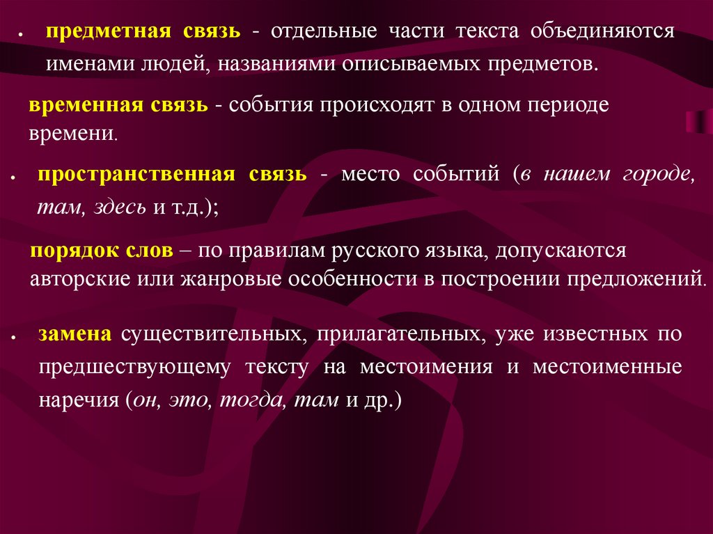 предметная связь - отдельные части текста объединяютсяименами людей, названиями описываемых предметов.