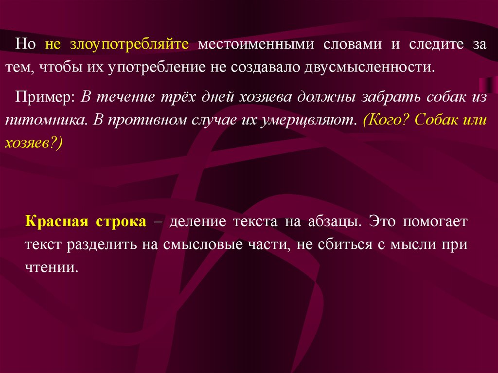 Но не злоупотребляйте местоименными словами и следите затем, чтобы их употребление не создавало двусмысленности.