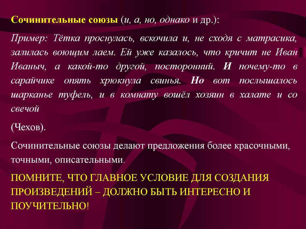 Сочинительные союзы делают предложения более красочными,