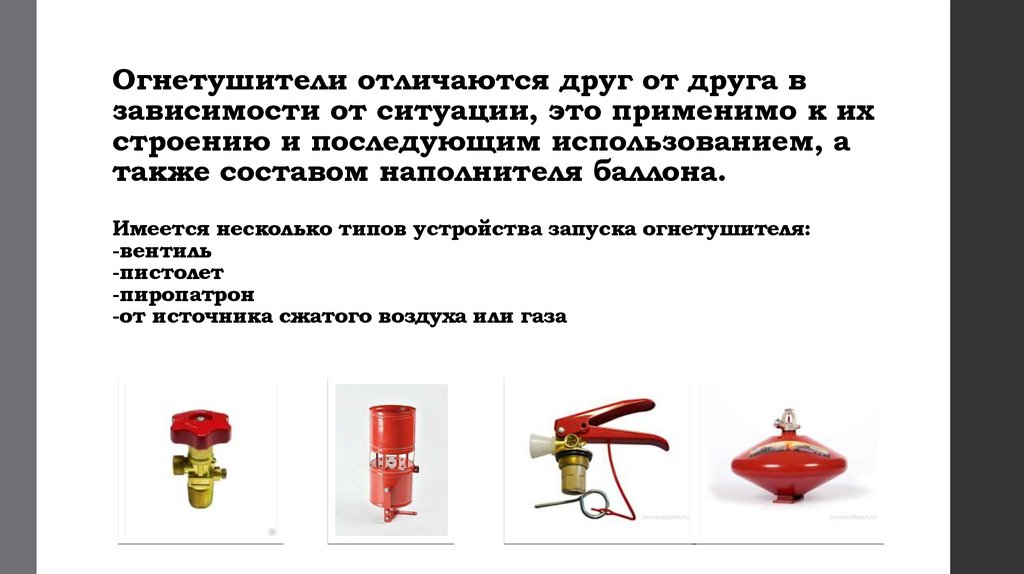 Имеется несколько типов устройства запуска огнетушителя: