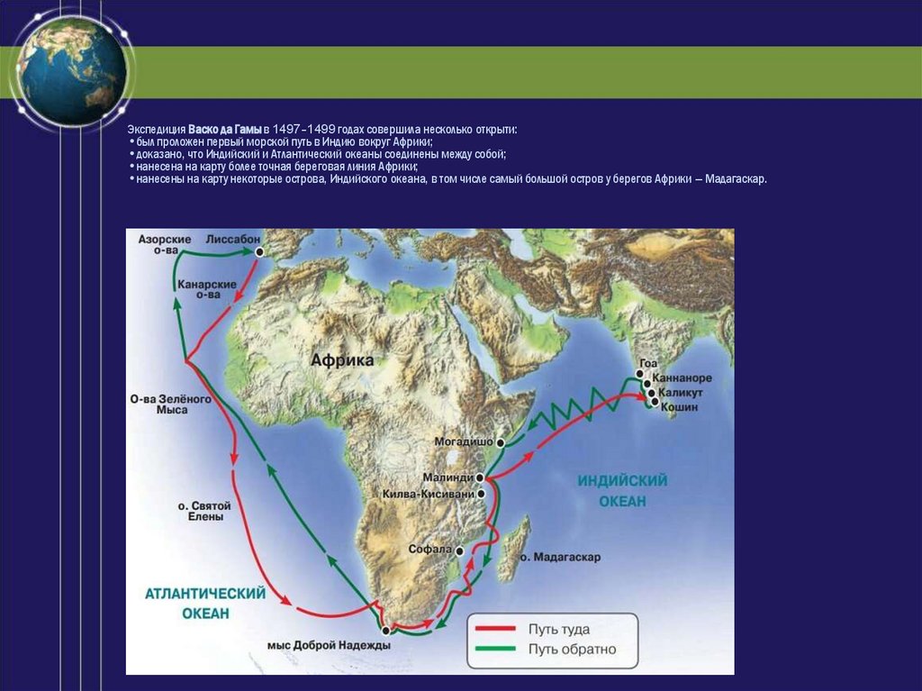 Экспедиция Васко да Гамы в 1497–1499 годах совершила несколько открыти:•был проложен первый морской путь в Индию вокруг Африки;